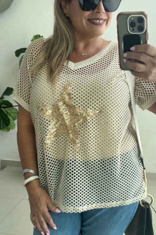 - Recibe el verano con nuestro Star Top. Esta blusa también funciona como cover up para la playa. Su hermosa estrella dorada le da un toque de glamour. Mantente elegante y fresco durante toda la temporada.