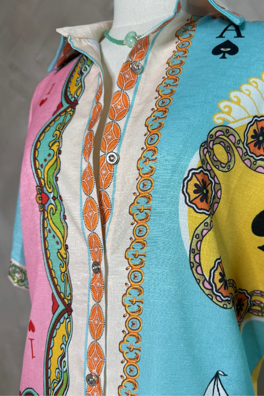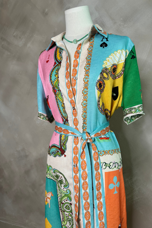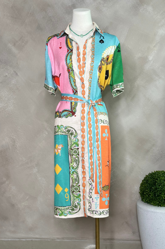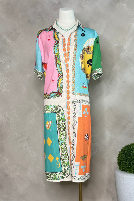 - Prepárate para jugar tu mejor mano con nuestro vestido de cartas. Confeccionado con un diseño de tarjeta único, este vestido es cómodo y fresco, perfecto para combinar con tenis o plataformas. Gana el juego de la moda mientras te mantienes cómodo todo el día.