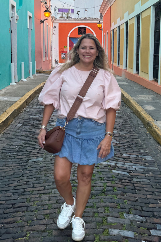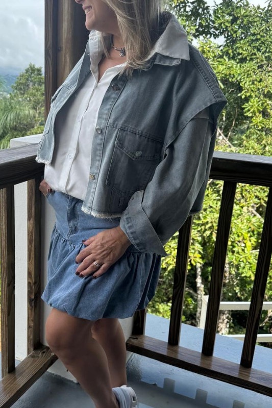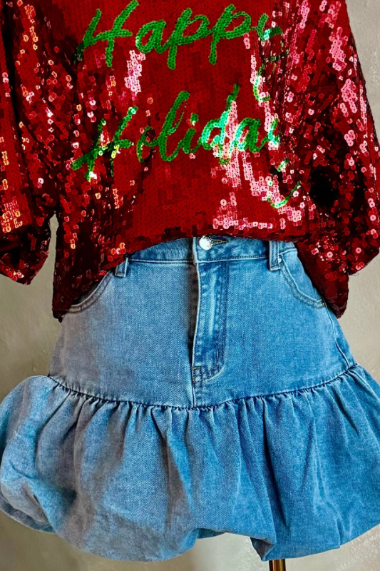 - Esta minifalda en denim en estilo de " bubble" está muy de moda, la puedes llevar con tus tenis favoritos o tus plataformas.