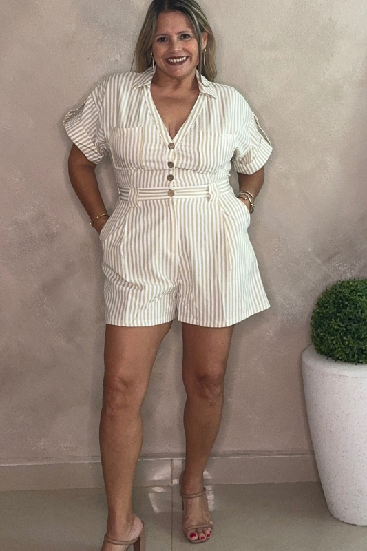 - Luce chic y bien vestida, cómoda con nuestro Lulu Romper de rayas beige, blancas.