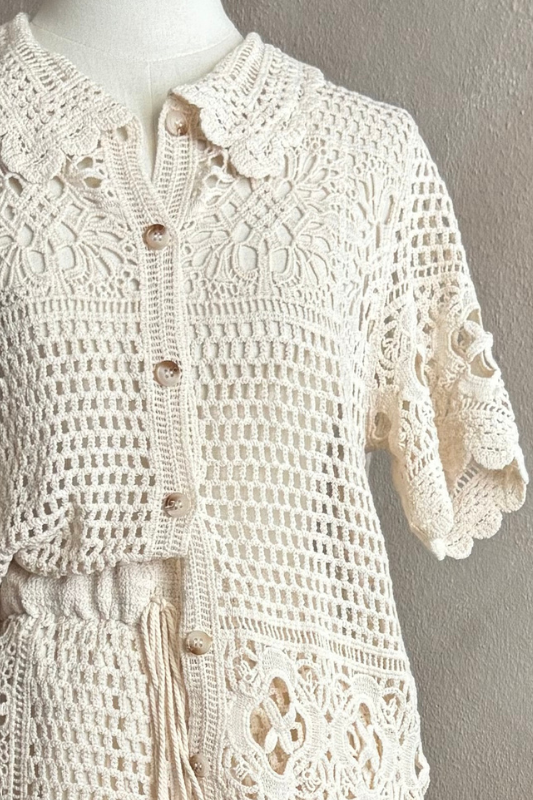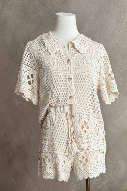 - Lleva tu look de fin de semana al siguiente nivel con nuestro Favi Set, este conjunto incluye una camisa de crochet y pantalones cortos, perfectos para un atuendo informal pero elegante. Mantente cómodo y a la moda con este conjunto único.