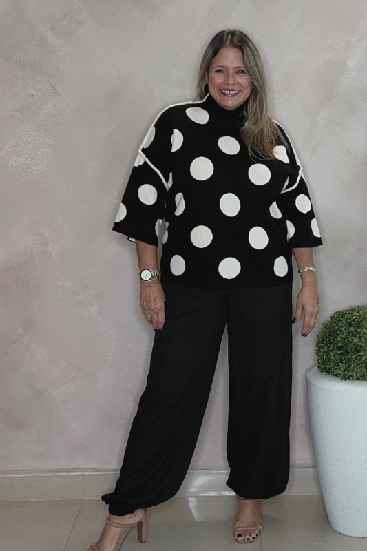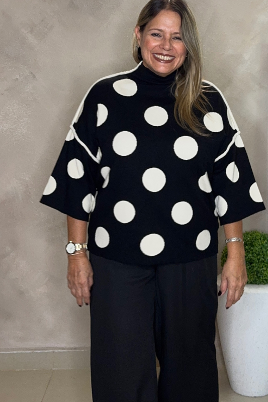 - Este sweater con estampado de polkadots es la prenda perfecta para darle un toque divertido y moderno a tu look. Su diseño te permitirá lucir bien vestida sin esfuerzo, ideal para cualquier ocasión donde quieras destacar con estilo.