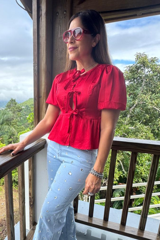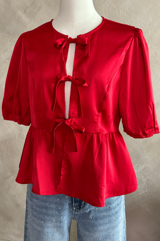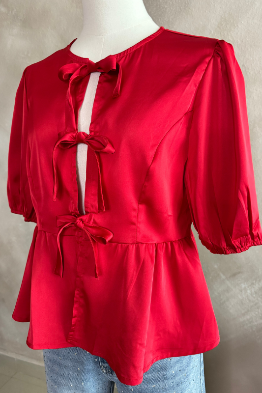 - Prepárate para llamar la atención con el Juliana Red Top. Confeccionada simulando seda, cierra en la parte con tres adorables lazos. Perfecto para los amantes de la moda y la elegancia.