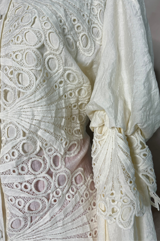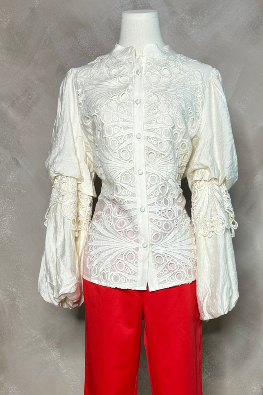 - Haz alarde de tu estilo con el top Lizie Eyelet. Esta hermosa blusa cuenta con elegantes mangas de encaje y un versátil color. Perfecto para una ocasión especial y llevar un look único y elegante.