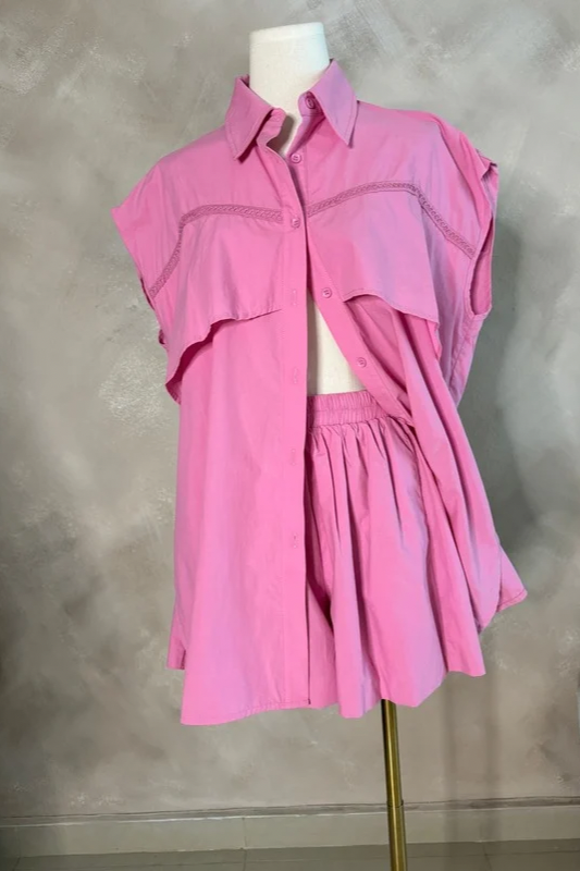 - Lucia short set lo puedes llevar para una ocasión casual, quieras lucir diferente y bien vestida. Diseñado para la comodidad, este conjunto de camisa y pantalón ligero fresco viene en un tono rosa muy lindo. Perfecto para un look divertido.