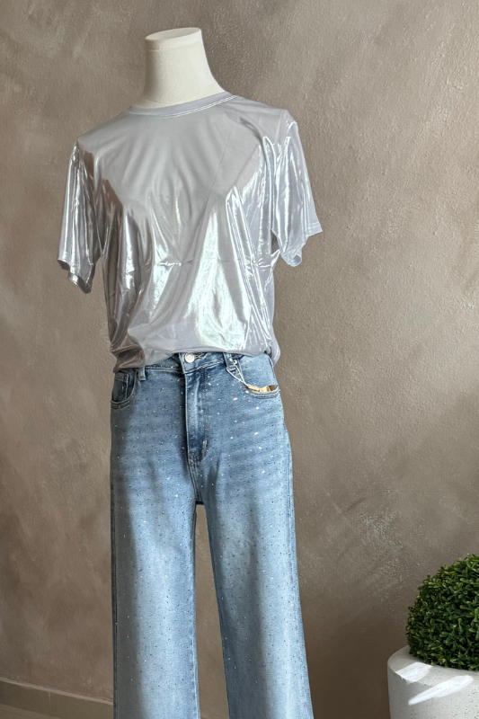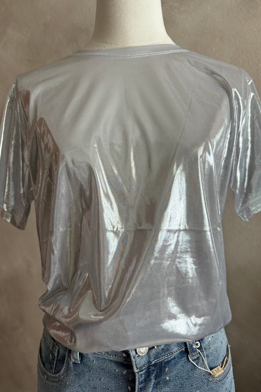 Esta camisa color plata es super moderna y cjhic para cualquier ocasion. añadiendo un toque de glamour a tu look.