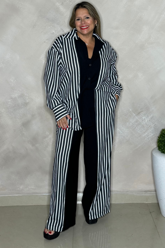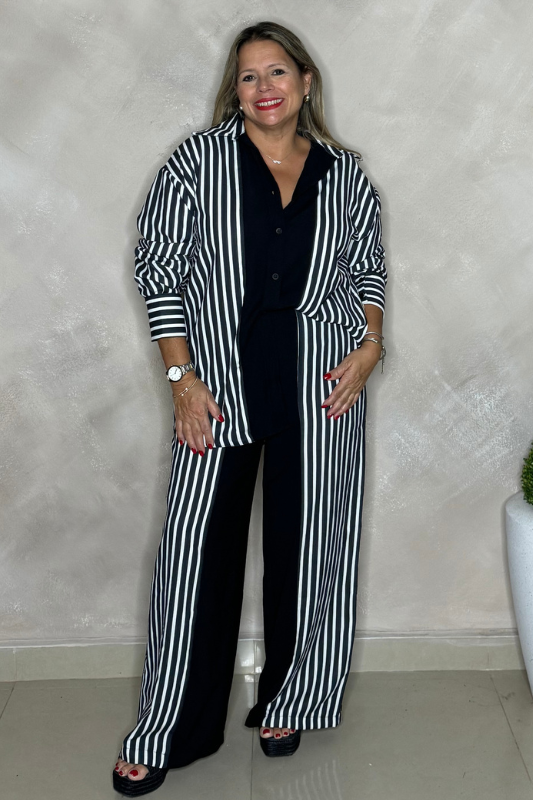 - Obtén lo mejor de ambos mundos con nuestro Stripes Set Power, una elegante combinación de pantalones de rayas blancas y negras camisa abotonada. Mantente elegante y cómoda todo el día.